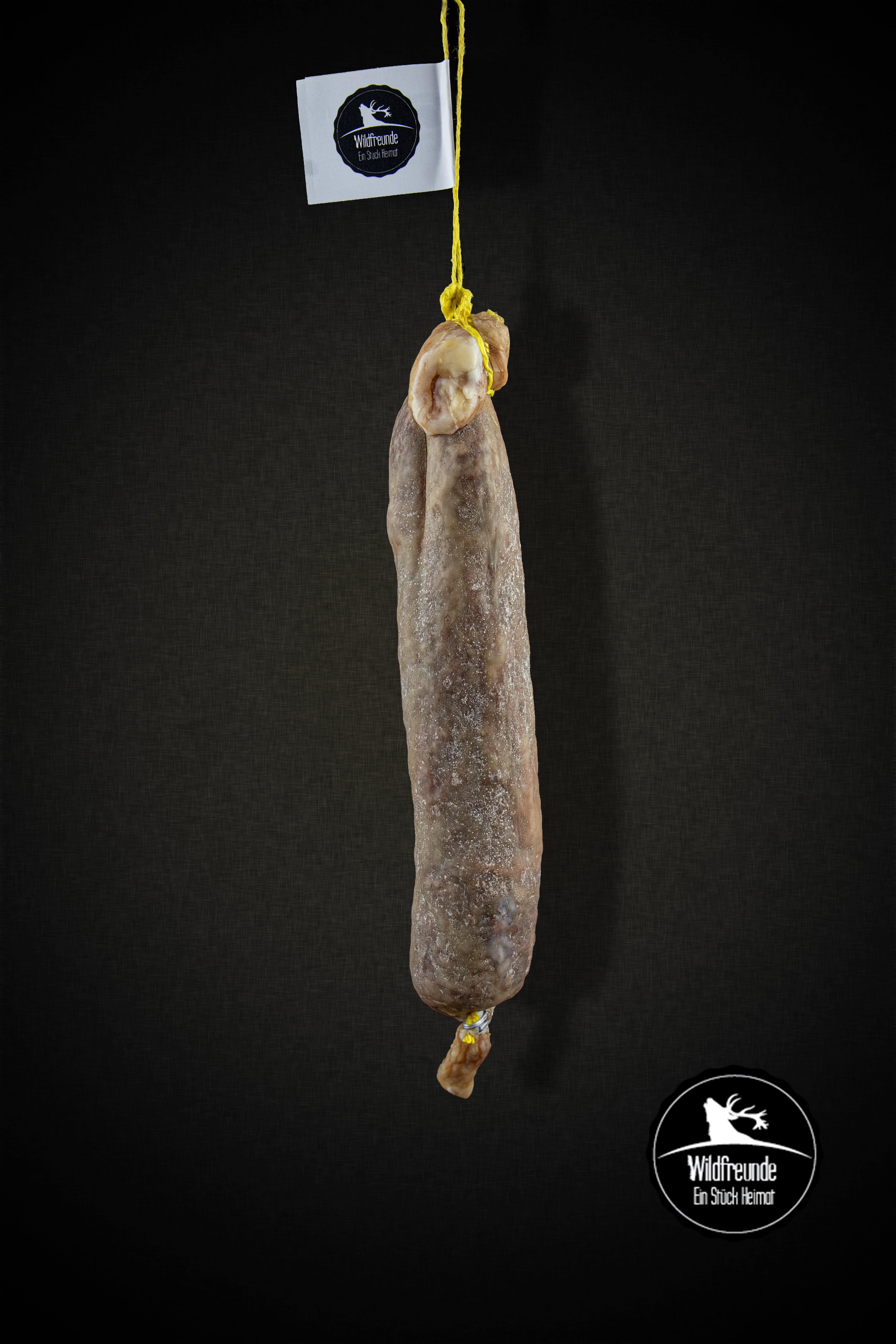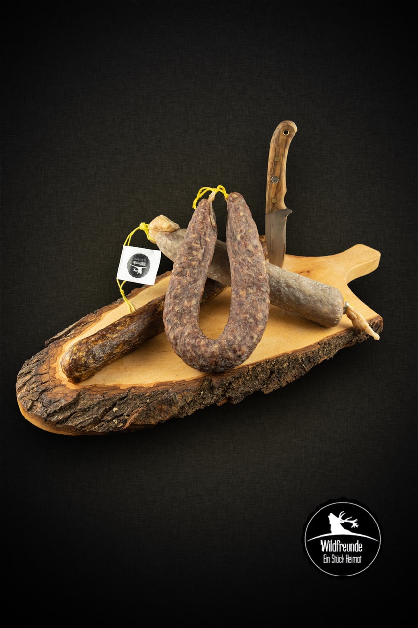 Unsere Wildwurst basiert auf der Ahlen Wurscht, eine Spezialität aus Nordhessen mit langer Tradition und unsere Herzensangelegenheit. Die Ahle Wurscht ist eine naturgereifte, ausschließlich aus schlachtwarmen Schweinefleisch hergestellte Wurstspezialität aus Nordhessen. Um ihren aromatischen Geschmack zu entfalten reift die Ahle Wurscht mindestens 8 Wochen in alten Lehmkammern.